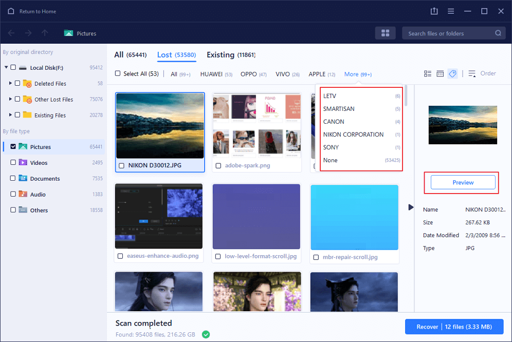필터를 클릭하여 필요한 파일 형식을 선택할 수 있습니다. EaseUS 데이터 복구 소프트웨어는 사진, 비디오, 문서, 이메일, 오디오, 또는 압축 파일등과 같은 1000개 이상의 파일 형식을 지원합니다.