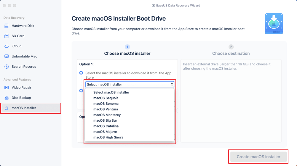 마지막으로, "macOS 설치 프로그램 만들기"를 선택하여 부팅 가능한 설치 프로그램 생성을 시작할 수 있습니다. macOS Sequoia, Sonoma, Ventura, Monterey, Big Sur 및 이전 버전과 같은 다양한 macOS 버전 중에서 선택할 수 있습니다.