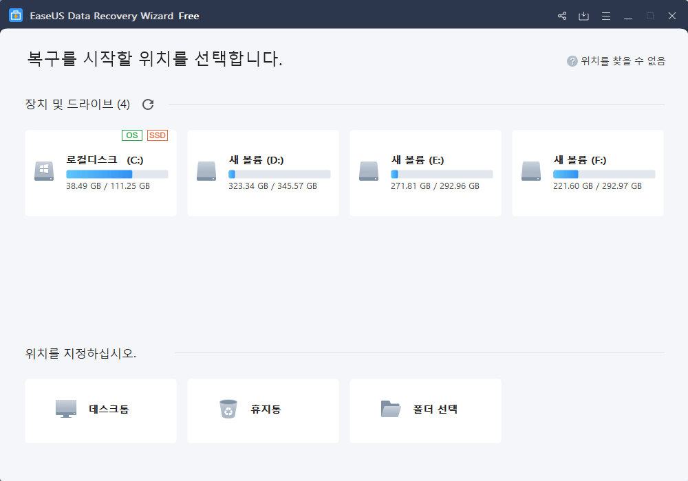 1 단계. PC에서 EaseUS Data Recovery Wizard를 실행하고 잃어버린 파일을 복구할 드라이브와 위치를 선택하고 "손실된 데이터 검색" 버튼을 클릭합니다.