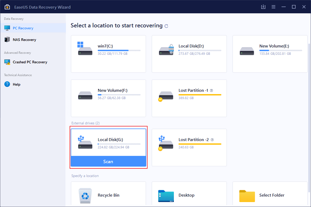 파일을 삭제한 드라이브를 선택하고 스캔을 시작하십시오. 이 소프트웨어를 사용하면 HDD, SSD, USB 드라이브, SD 카드, 펜 드라이브, 카메라 등 모든 장치에서 손실된 데이터를 복구할 수 있습니다.